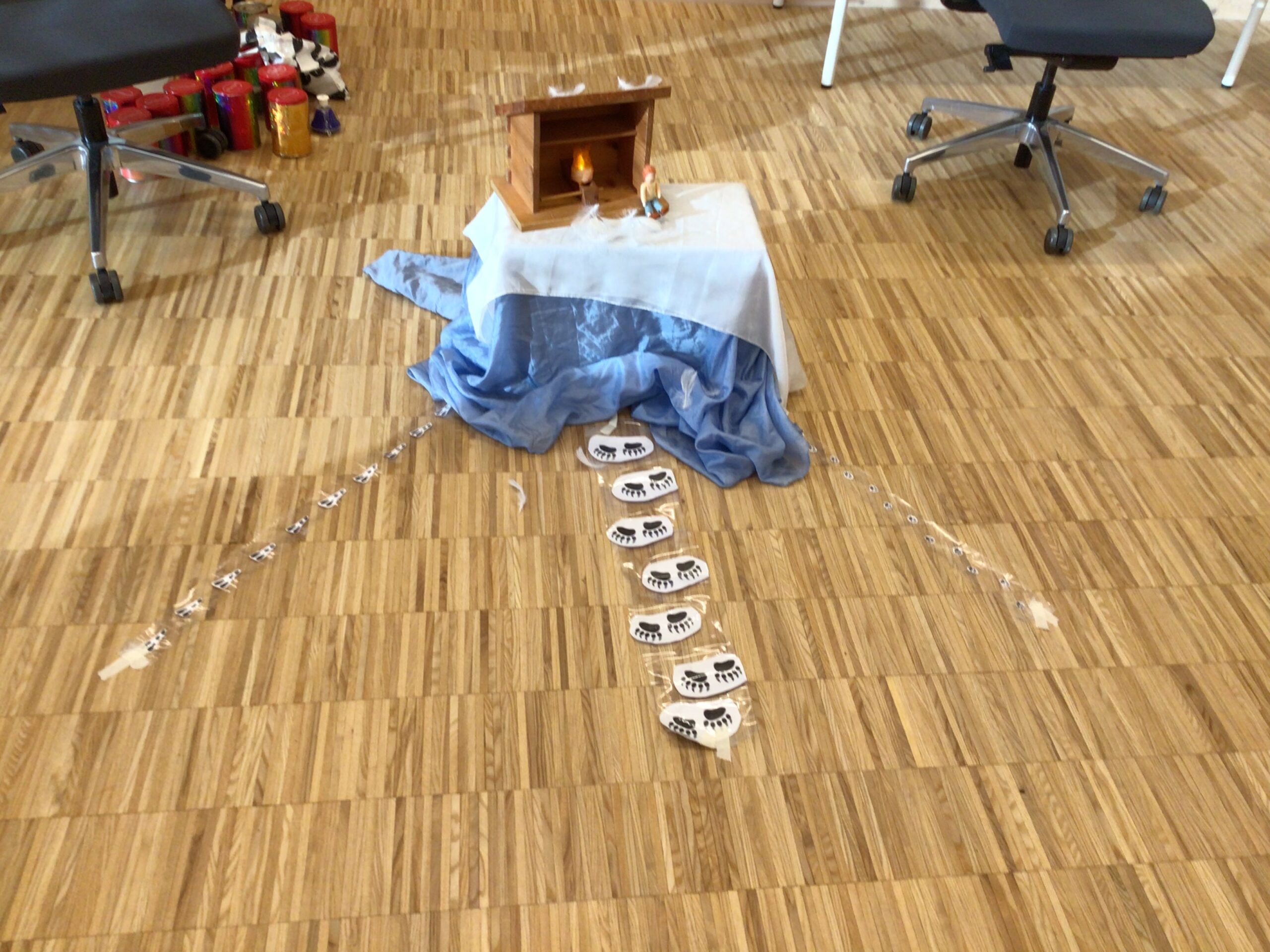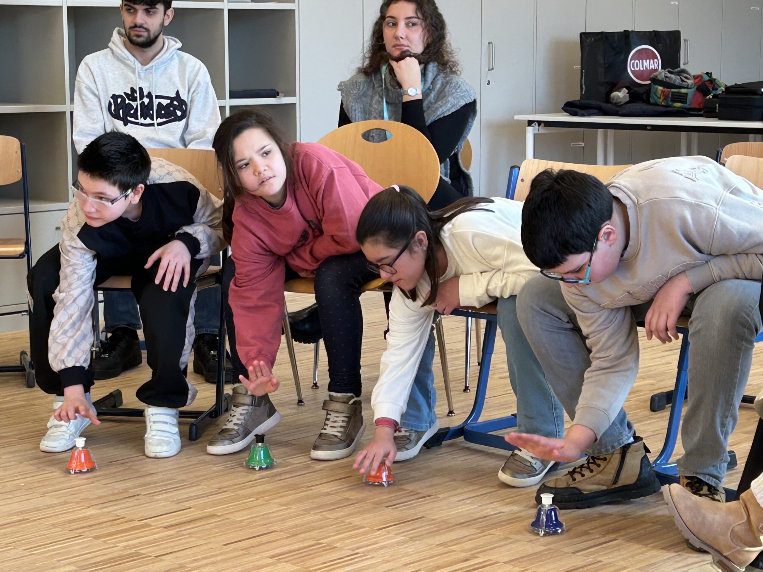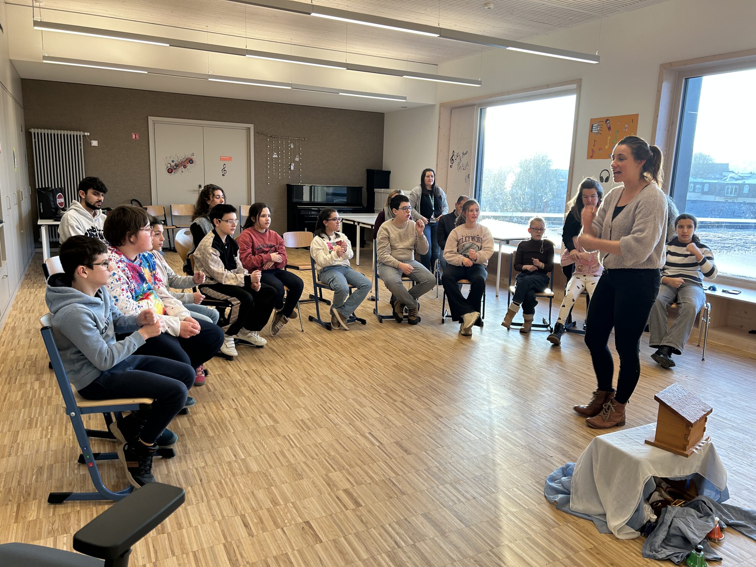Die SchülerInnen des CDI gemeinsam mit Schülern des Cycle 2 der Grundschule Echternach wurden aktiv in die Geschichte eingebunden und stellten mit viel Spaß und Interesse Geräusche und Handlungen der Wintergeschichte mithilfe von Instrumenten nach.
